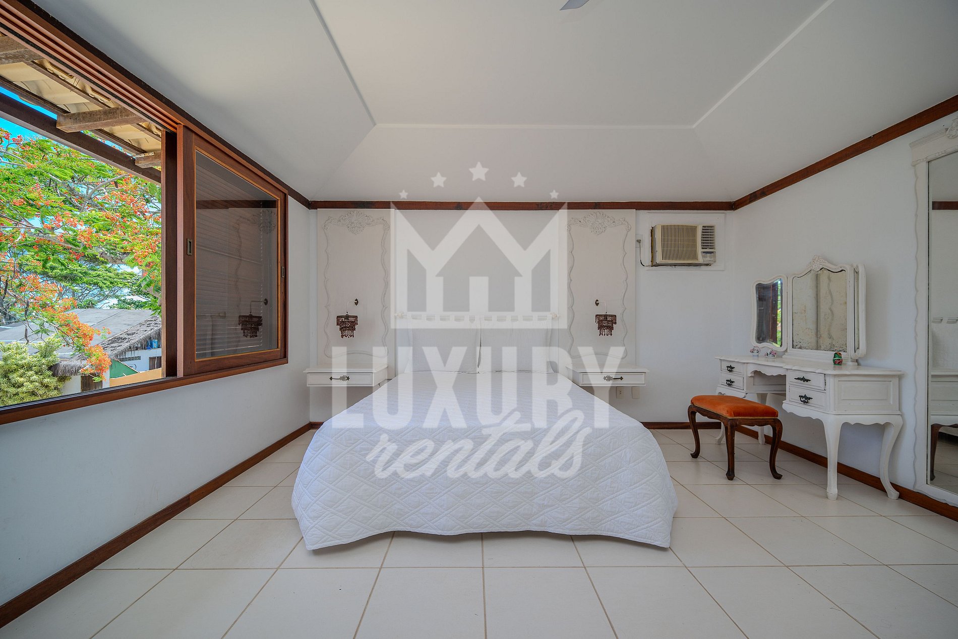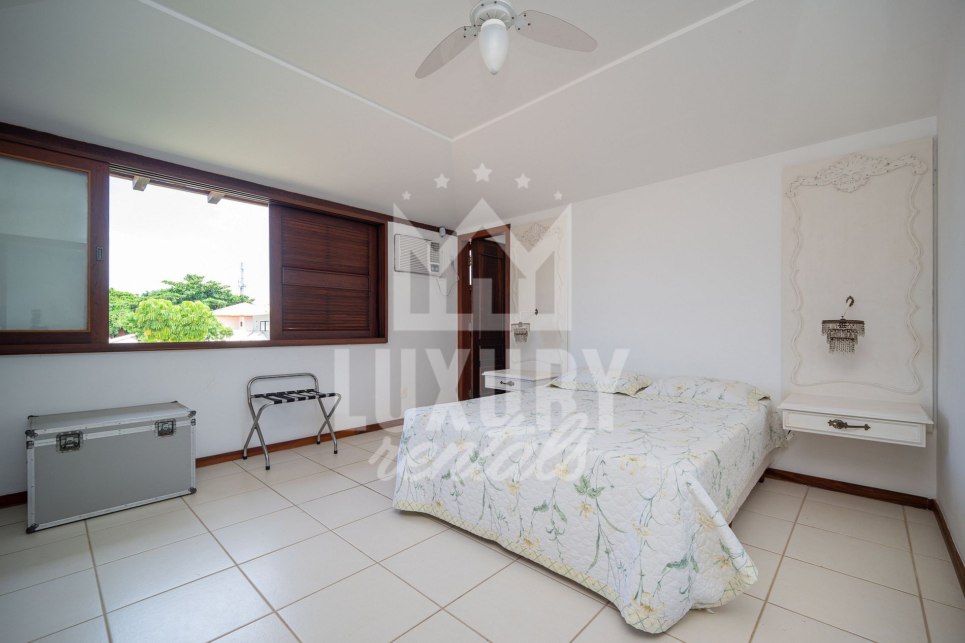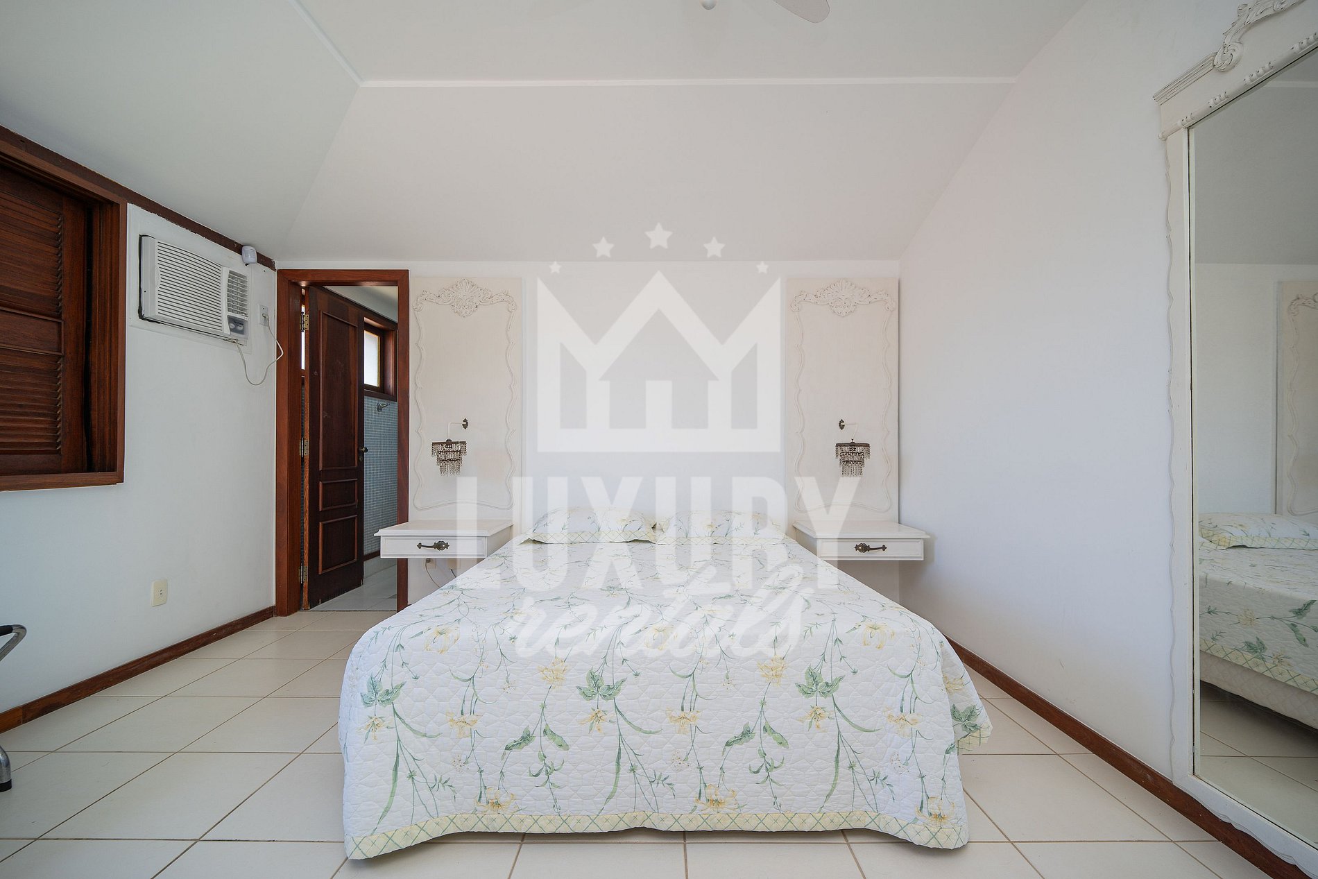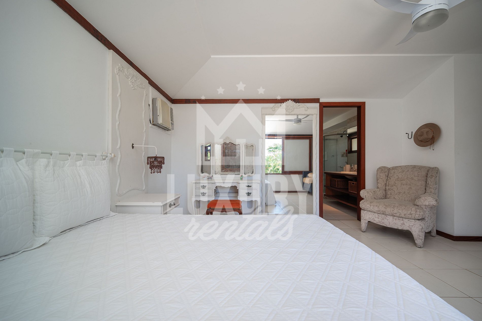 A Casa é composta por 5 Suítes, todas com Ar Condicionado, Roupas de Cama e Banho.