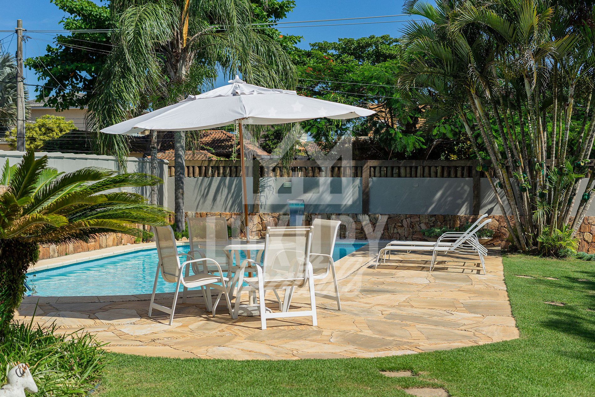 Na Área Externa temos uma linda Mesa de Jantar, Churrasqueira, Piscina com Espreguiçadeira e mesa com Guarda Sol e um Lindo Gramado.