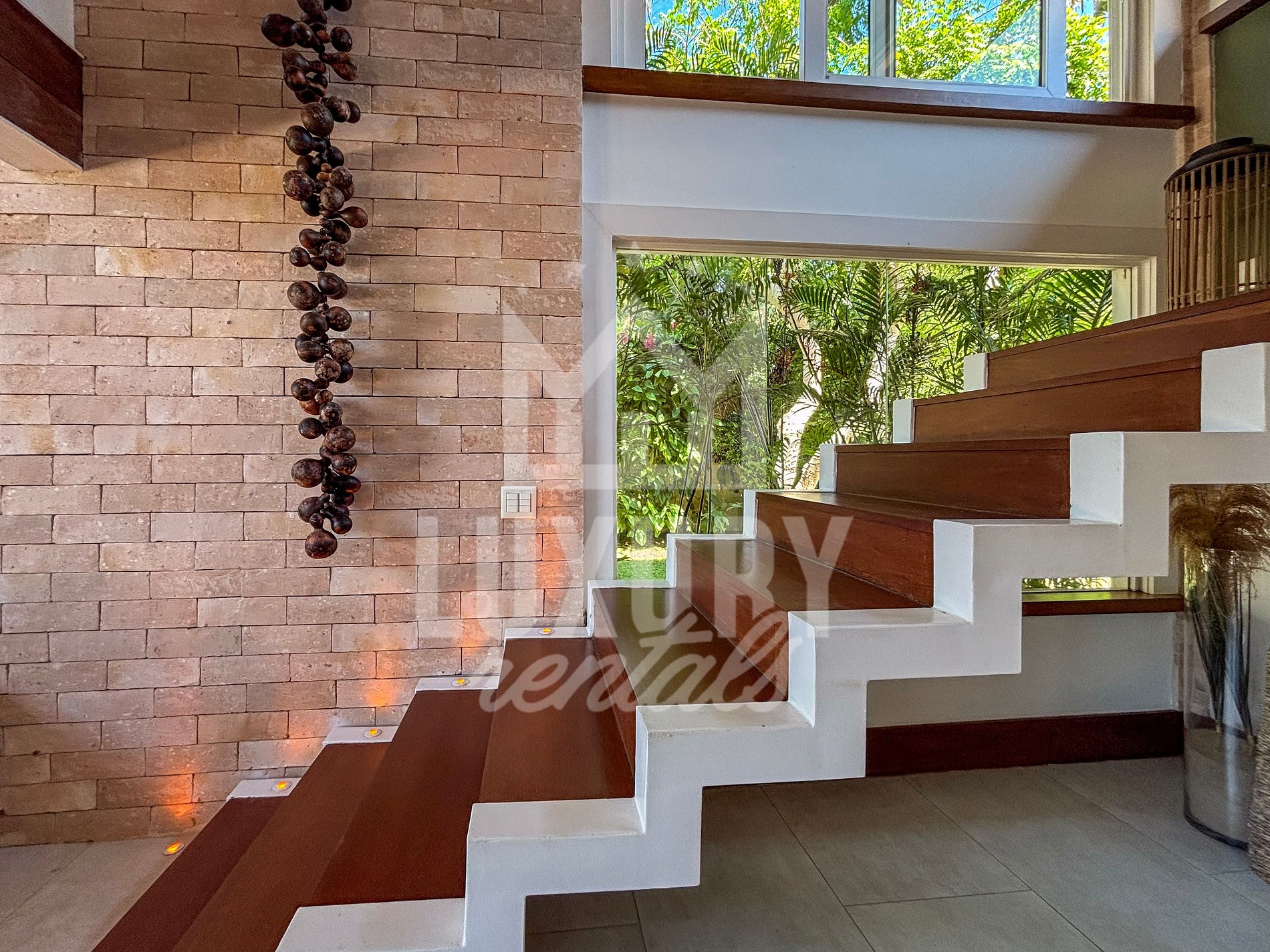 Seis suítes elegantemente decoradas oferecem o máximo em privacidade e bem-estar. Duas delas, com charmosos mezaninos, proporcionam um toque especial à hospedagem de seus convidados. A suíte master, um verdadeiro oásis particular, dispõe de um amplo closet e uma varanda privativa com uma vista para o oceano – um palco perfeito para momentos de relaxamento e contemplação.