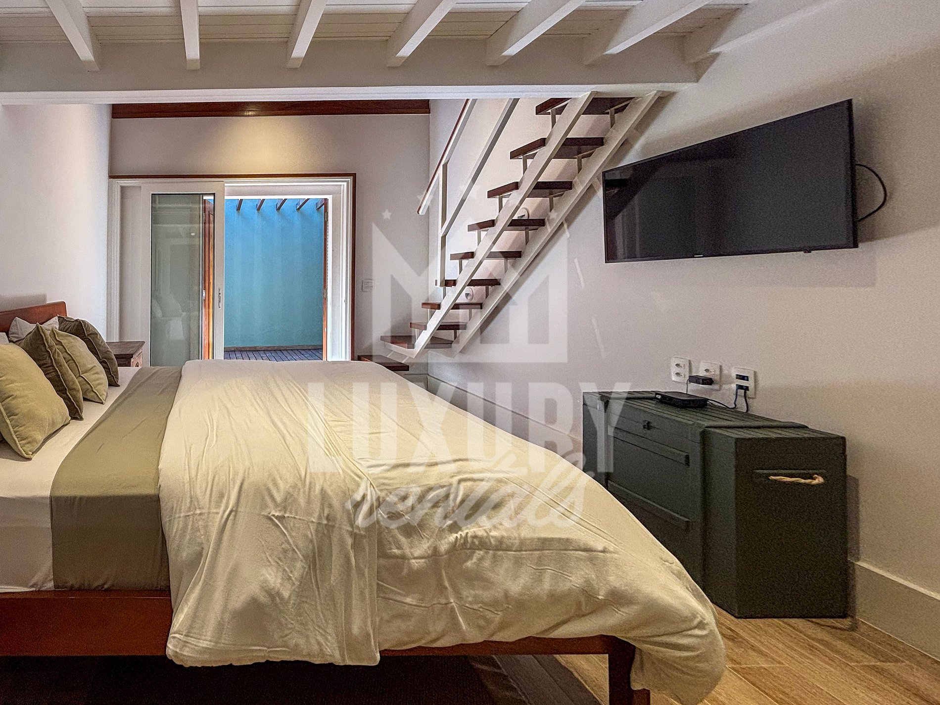Seis suítes elegantemente decoradas oferecem o máximo em privacidade e bem-estar. Duas delas, com charmosos mezaninos, proporcionam um toque especial à hospedagem de seus convidados. A suíte master, um verdadeiro oásis particular, dispõe de um amplo closet e uma varanda privativa com uma vista para o oceano – um palco perfeito para momentos de relaxamento e contemplação.