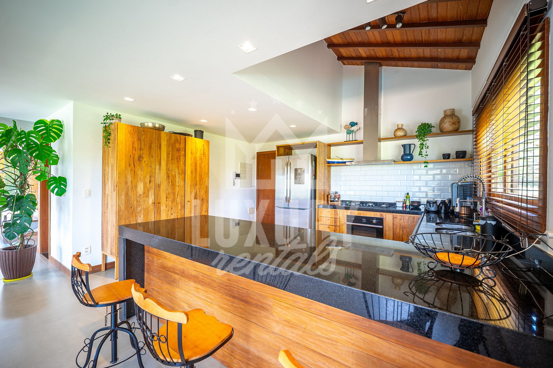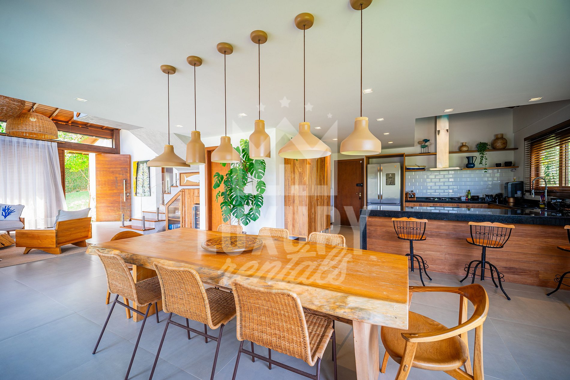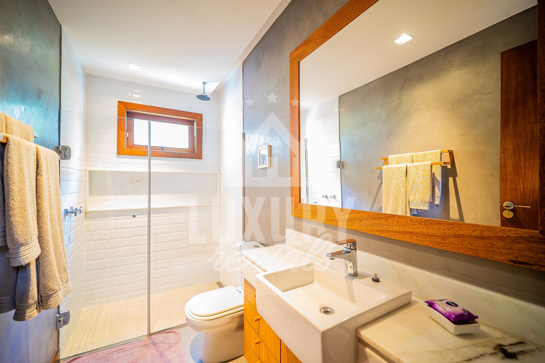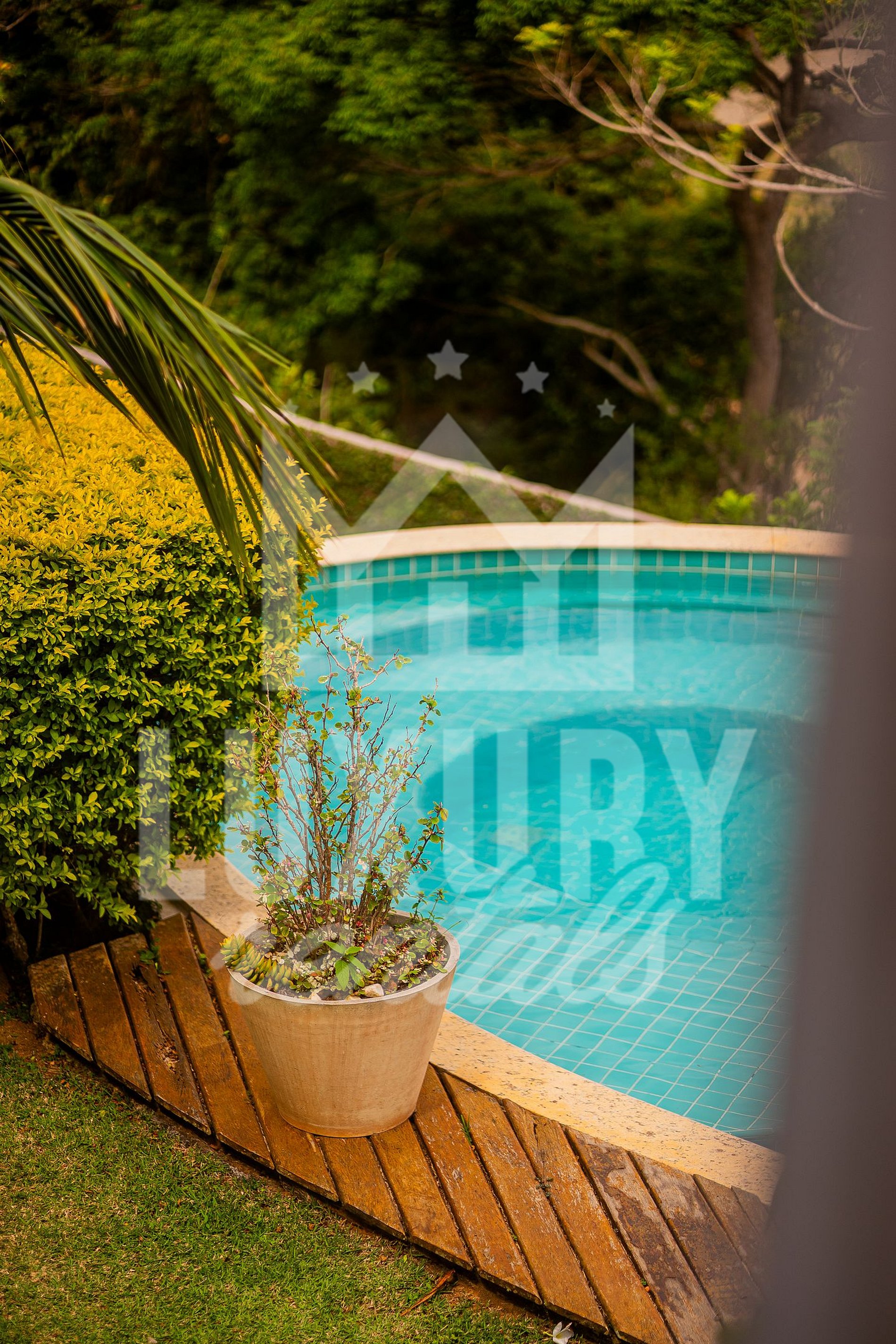 Área de Lazer dos Sonhos: Nossa piscina de design orgânico é cercada por um amplo deck de madeira e jardins, perfeita para tomar sol. Gourmet Completo: Área de churrasqueira incrível com teto de bambu, forno de pizza a lenha, balcão de bar e fechamento em vidro – ideal para confraternizar em qualquer clima. Arquitetura Única: Pé-direito duplo, vigas de madeira nobre e paredes de pedra natural criam uma atmosfera acolhedora e sofisticada. Privacidade: São 6 suítes espaçosas e climatizadas, garantindo conforto total para todos os hóspedes.
