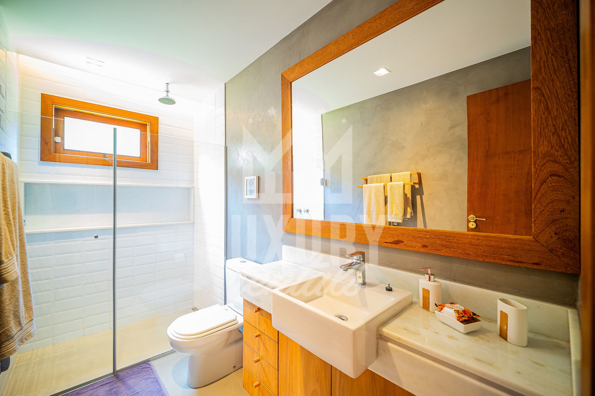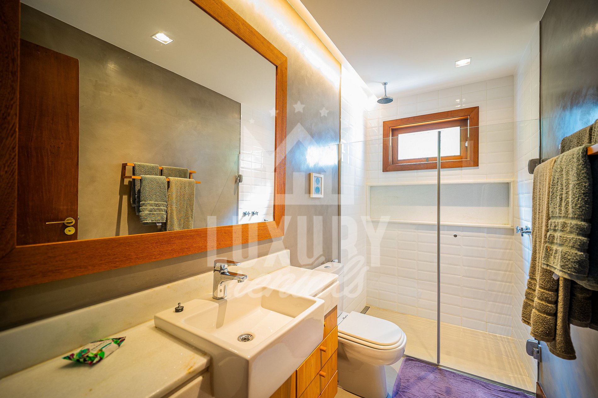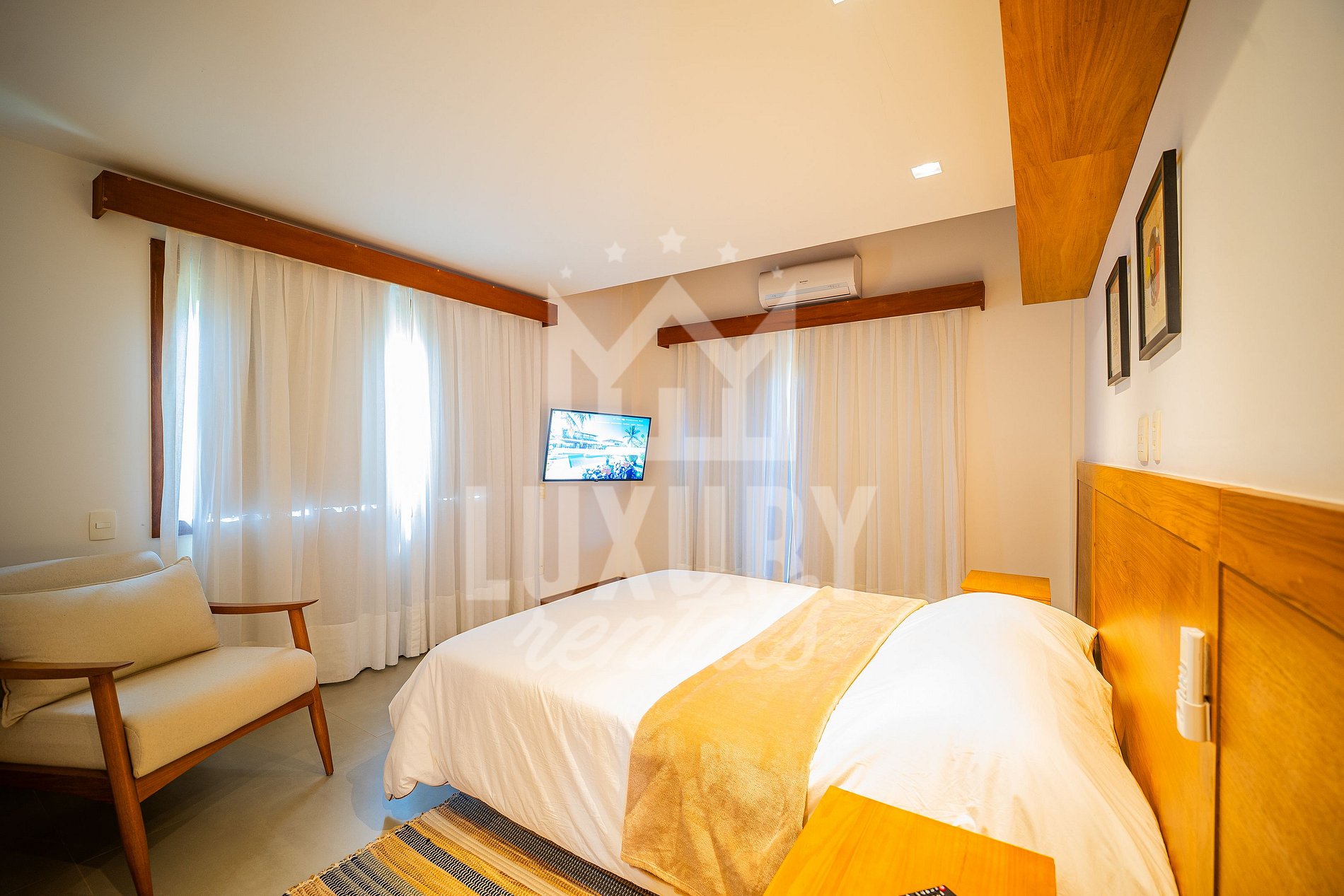 Área de Lazer dos Sonhos: Nossa piscina de design orgânico é cercada por um amplo deck de madeira e jardins, perfeita para tomar sol. Gourmet Completo: Área de churrasqueira incrível com teto de bambu, forno de pizza a lenha, balcão de bar e fechamento em vidro – ideal para confraternizar em qualquer clima. Arquitetura Única: Pé-direito duplo, vigas de madeira nobre e paredes de pedra natural criam uma atmosfera acolhedora e sofisticada. Privacidade: São 6 suítes espaçosas e climatizadas, garantindo conforto total para todos os hóspedes.