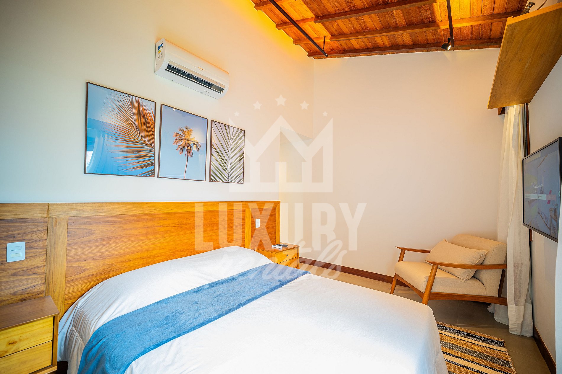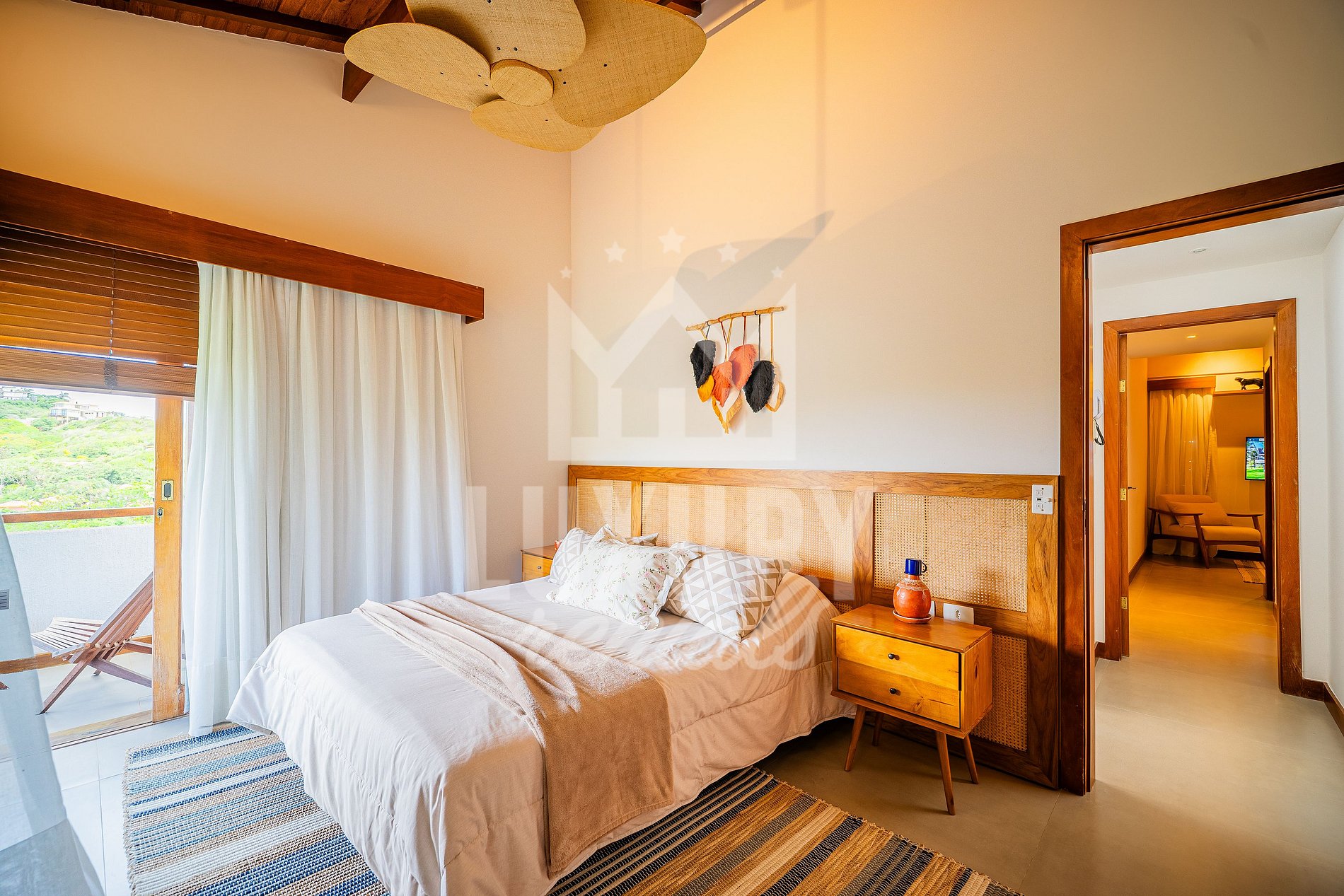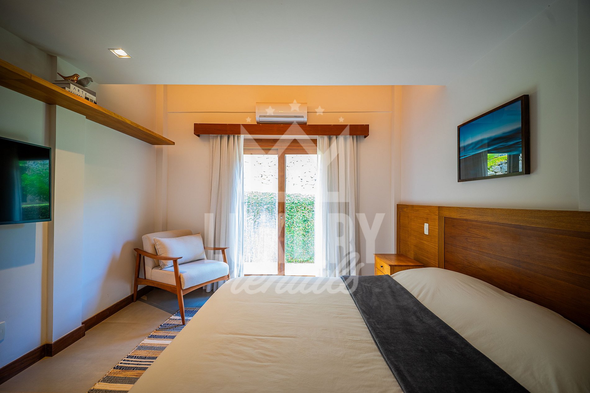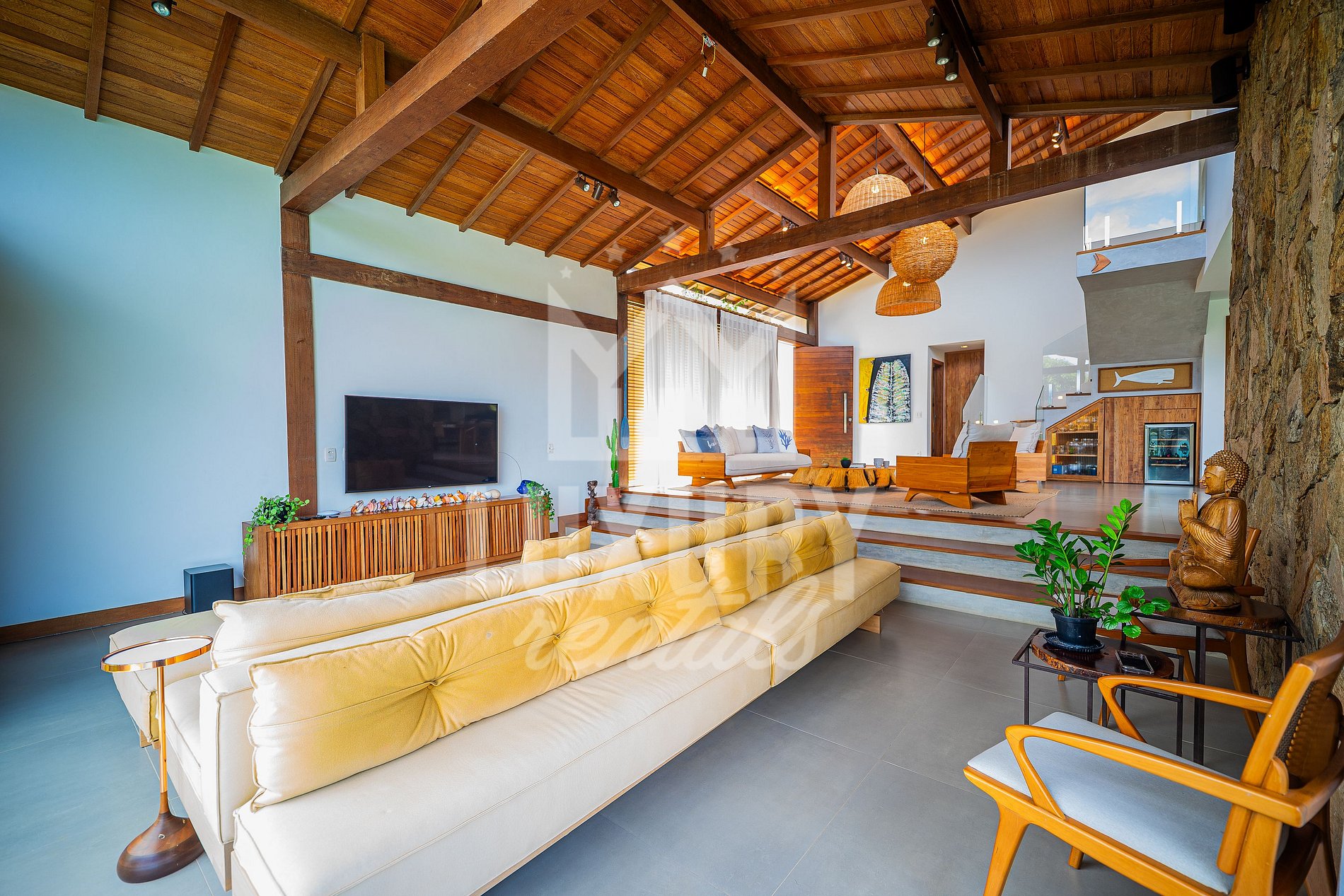 Área de Lazer dos Sonhos: Nossa piscina de design orgânico é cercada por um amplo deck de madeira e jardins, perfeita para tomar sol. Gourmet Completo: Área de churrasqueira incrível com teto de bambu, forno de pizza a lenha, balcão de bar e fechamento em vidro – ideal para confraternizar em qualquer clima. Arquitetura Única: Pé-direito duplo, vigas de madeira nobre e paredes de pedra natural criam uma atmosfera acolhedora e sofisticada. Privacidade: São 6 suítes espaçosas e climatizadas, garantindo conforto total para todos os hóspedes.