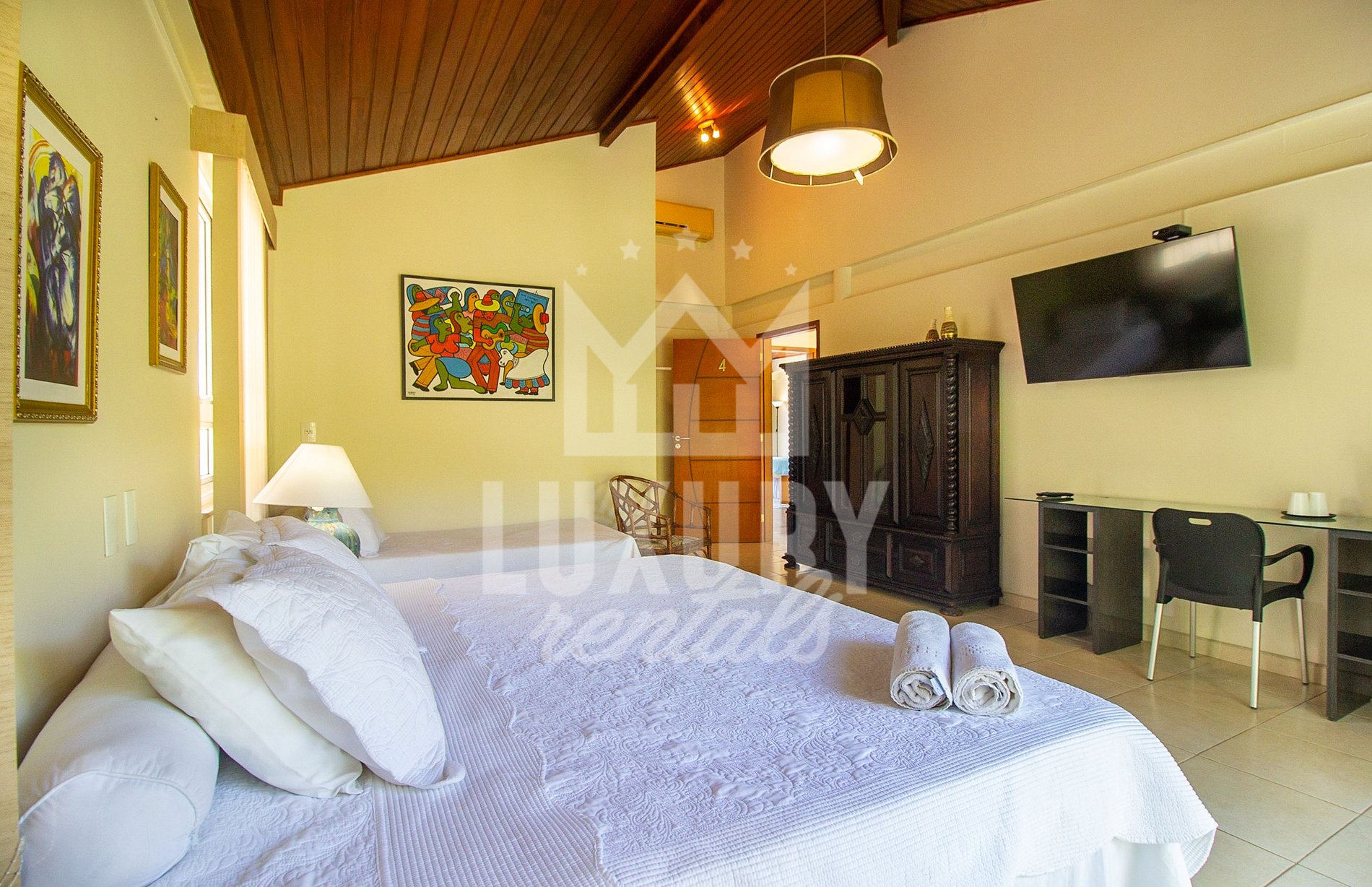 A Excelente Área Interna da Residência vai lhe Proporcionar Cinco Suítes, sendo Suíte Máster com Hidromassagem, todas Possuindo Ar Condicionado, Roupa de Cama; Duas Amplas Sala de Estar, Sala de Jantar, Cozinha com todos os Utensílios e Rede Wi-Fi que abrange toda a Residência.