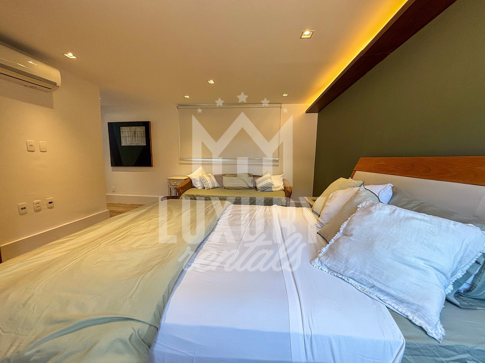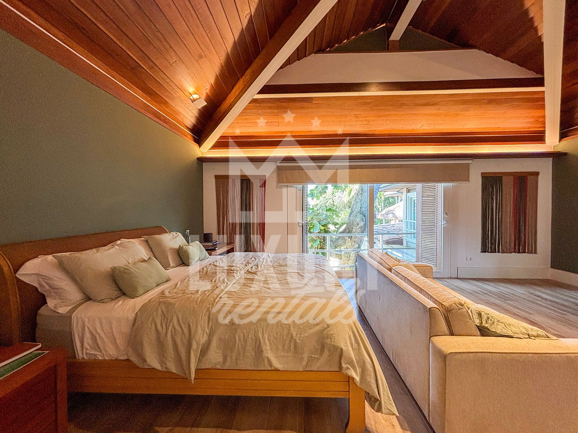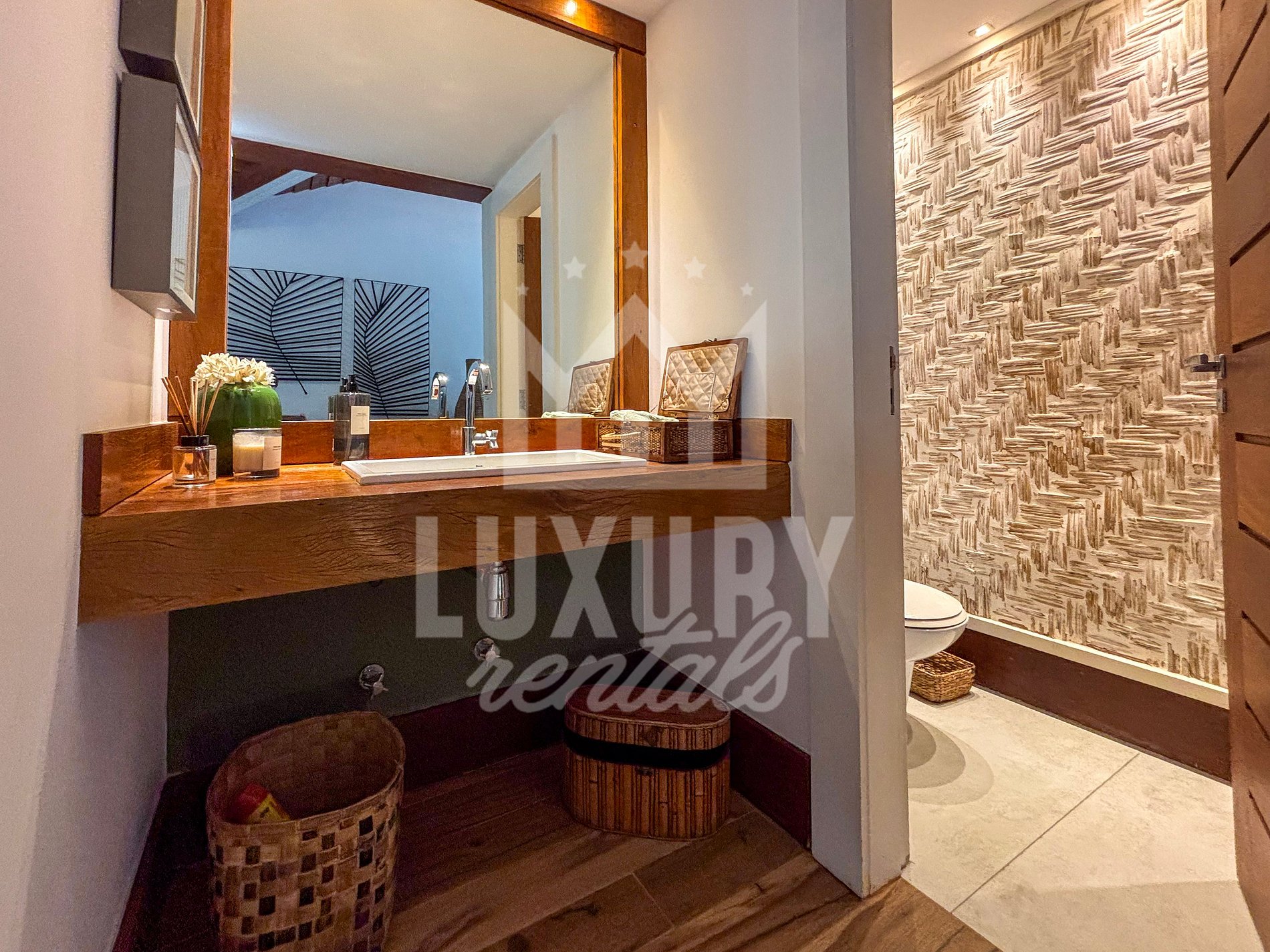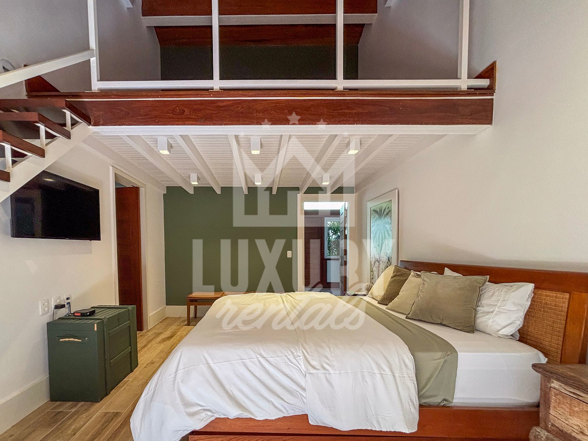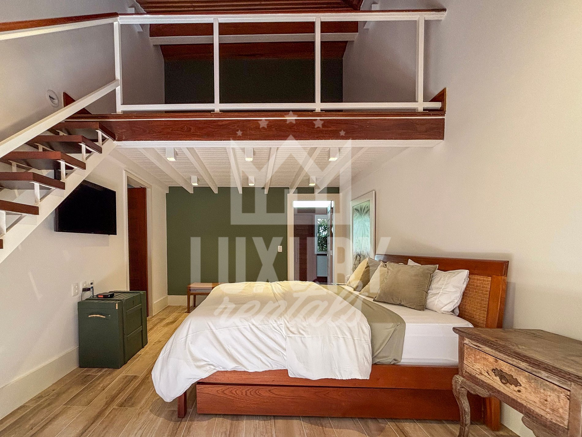 Seis suítes elegantemente decoradas oferecem o máximo em privacidade e bem-estar. Duas delas, com charmosos mezaninos, proporcionam um toque especial à hospedagem de seus convidados. A suíte master, um verdadeiro oásis particular, dispõe de um amplo closet e uma varanda privativa com uma vista para o oceano – um palco perfeito para momentos de relaxamento e contemplação.