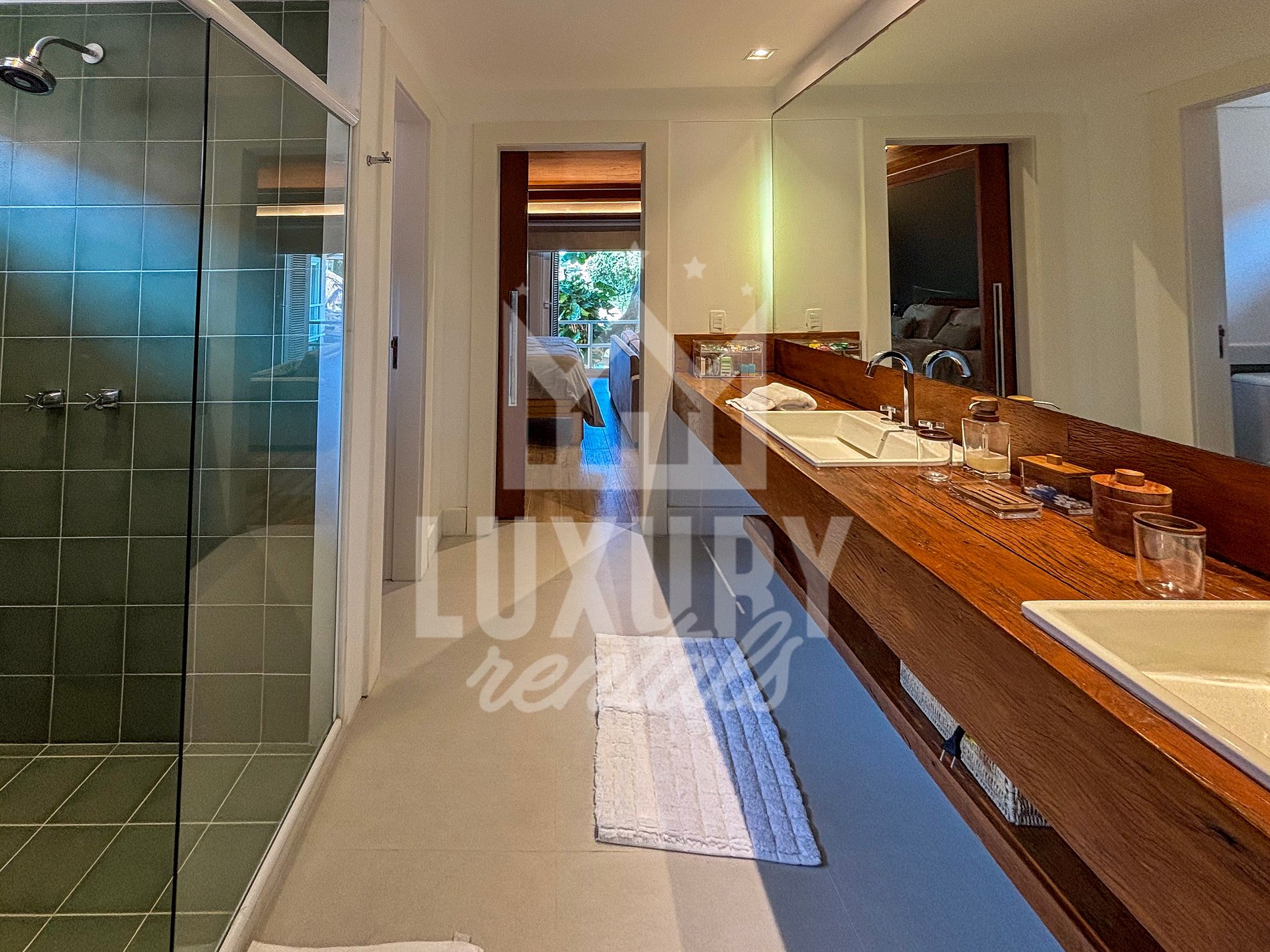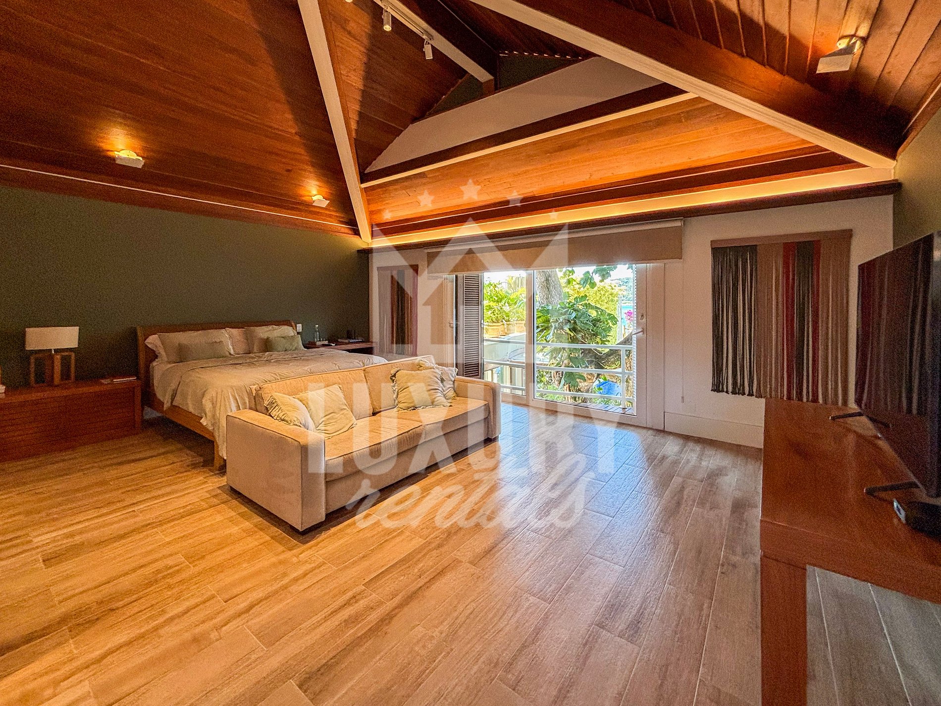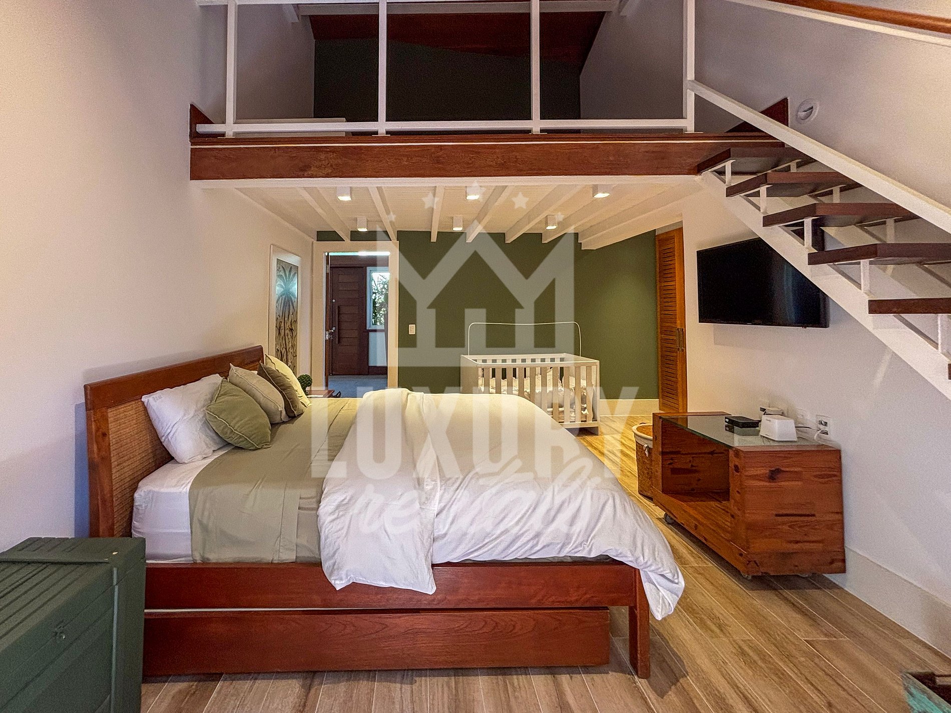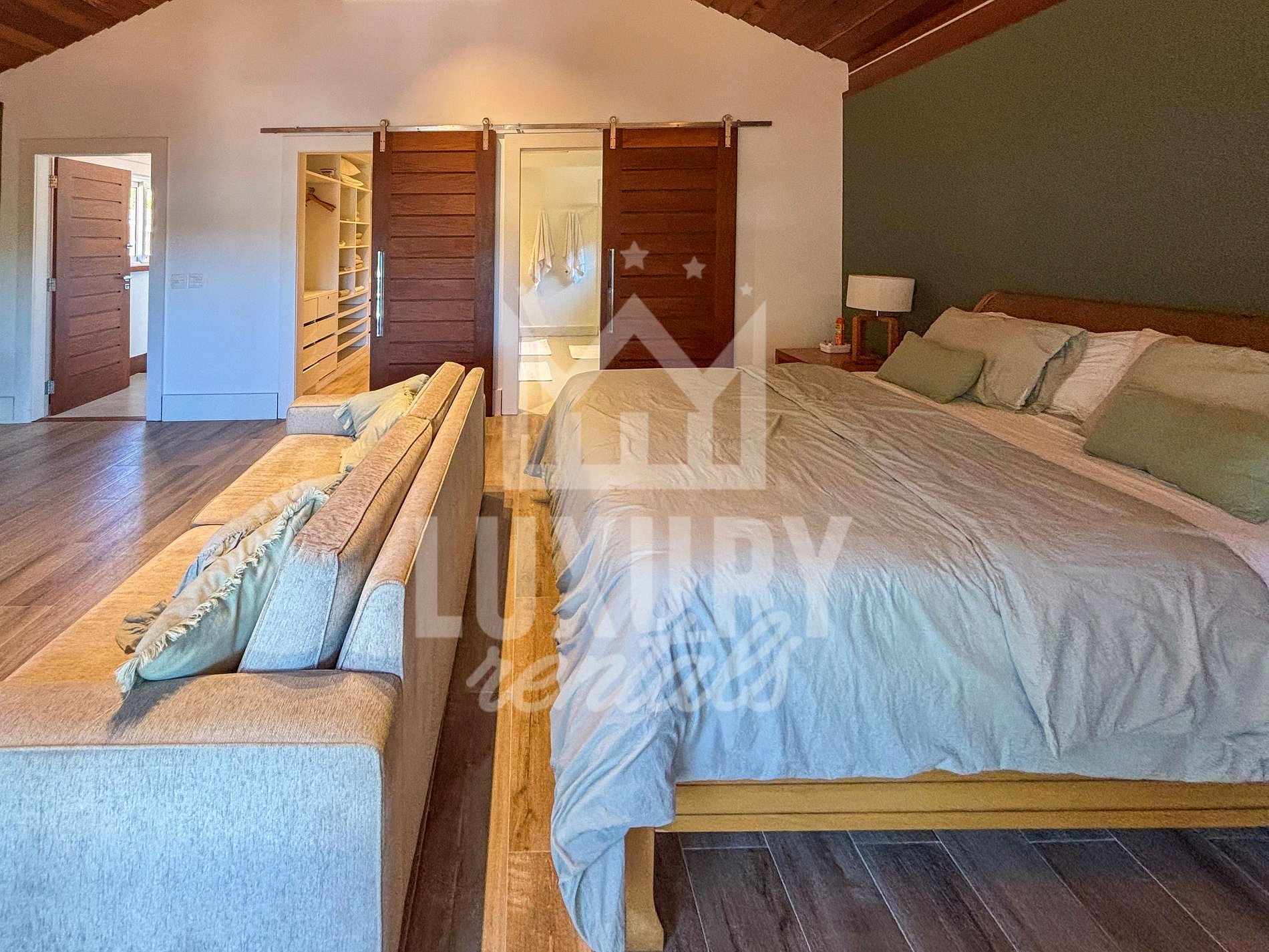 Seis suítes elegantemente decoradas oferecem o máximo em privacidade e bem-estar. Duas delas, com charmosos mezaninos, proporcionam um toque especial à hospedagem de seus convidados. A suíte master, um verdadeiro oásis particular, dispõe de um amplo closet e uma varanda privativa com uma vista para o oceano – um palco perfeito para momentos de relaxamento e contemplação.